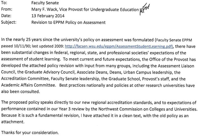 Pursuant to the mission of the University (Faculty Manual (2010), p. 2-3), WSU is mandated to provide specific educational outcomes to its undergraduate and graduate students. In fulfillment of this mission, academic responsibility for a given academic unit is from the academic faculty through the chair or director, through the academic dean and to the Provost