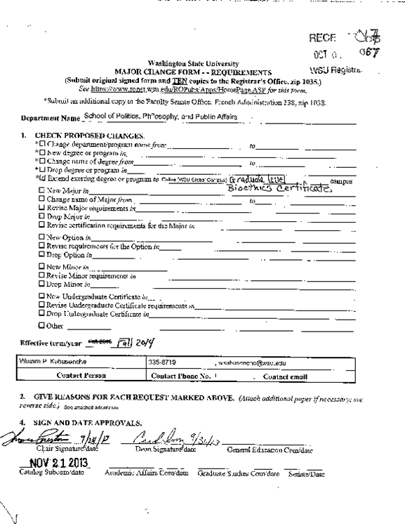 - Recommendation from Graduate Studies Committee on the proposal to extend the graduate certificate in Bioethics offered by the School of Philosophy, Politics, and Public Affairs to the WSU Global Campus (Exhibit V, V1 ) as follows:
