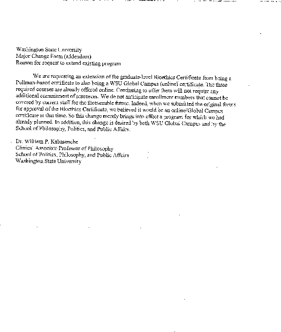 On Tuesday, February 18th, the Graduate Studies Committee approved the proposal to extend the graduate certificate in Bioethics offered by the School of Philosophy, Politics, and Public Affairs to the WSU Global Campus. Please forward this to the Faculty Senate for appropriate approvals.